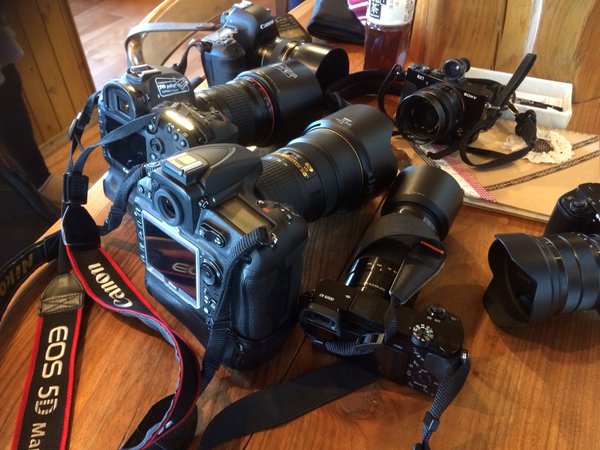 撮影機材の山。。 このカメラ達に加えて人物撮影用にストロボなど大量に持ってきていたので、荷物が重たそうでした。