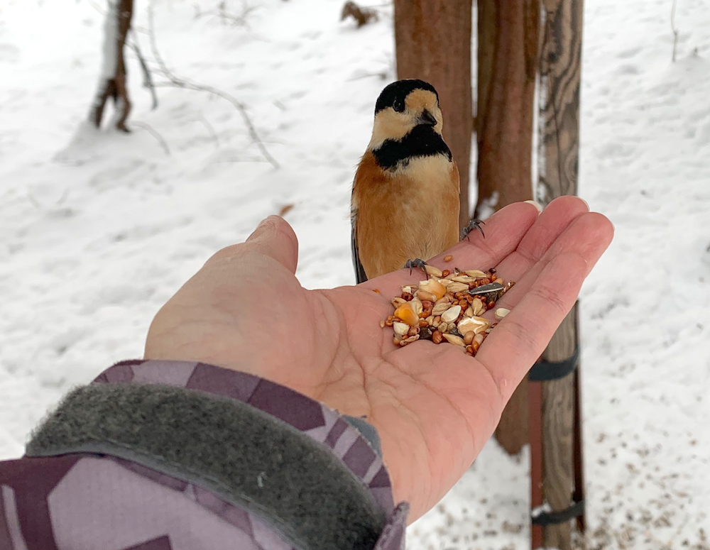 先日のツアー中に、お客さんとエゾリスを撮りに来たつもりが、小鳥に好かれる^^